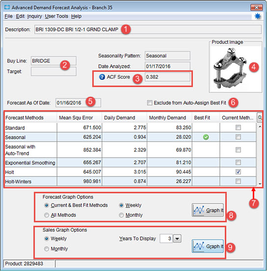 After running the Advanced Demand Forecast Program, you can retrieve visual results using the Advanced Demand Forecast Analysis. The analysis provides the results for each selected for product or line and the selected methods.