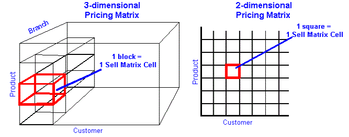 The purpose of a matrix cell is to define parameters that determine how your products are priced. A matrix cell can be set up as a two- or three-dimensional matrix, as shown below.